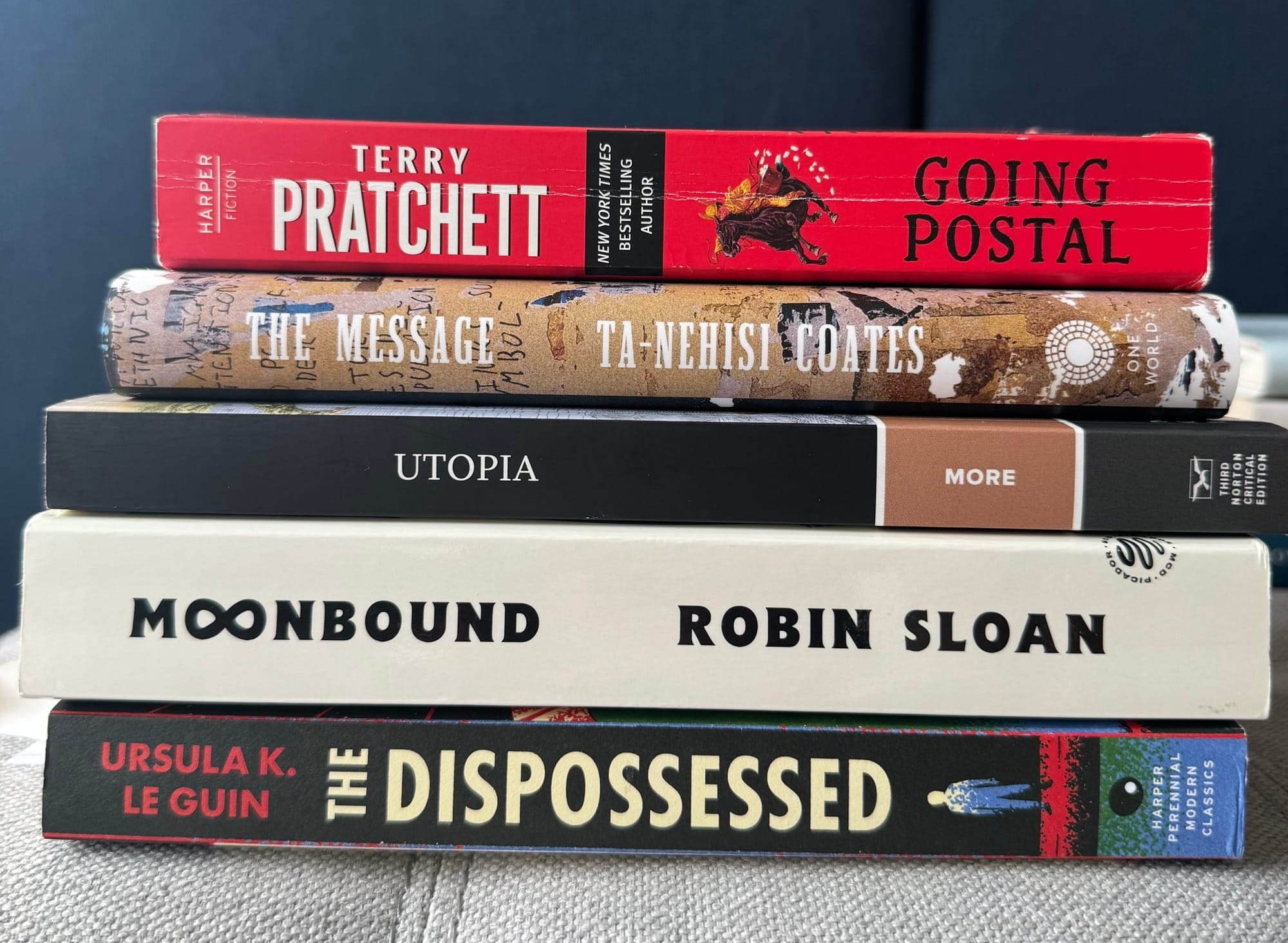 Moonbound has already been touched on, but The Dispossessed is my current read and I think the two go hand in hand beautifully. The anarchism Le Guin explores on Anarres is worth thinking through because it raises the question: what does a perfect society look like? Is it a world where nobody works, or one where everybody does? Sloan brings his own answer to life in Moonbound.